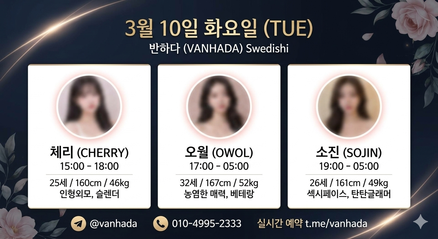 | [3월 9일] 울산 달동 반하다 스웨디시 출근부 - 체리·오월·소진 매니저 안내 (0) | 2026.03.09 |